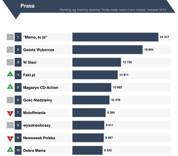 Wskaźnik „Liczba osób, które o tym mówią” na poziomie 13 730 sprawił, że tygodnik zajął ostatnie miejsce na podium tego rankingu (również jedno miejsce w górę w porównaniu do października), wyprzedzając m.in. Fakt, Gościa Niedzielnego, Newsweek Polska czy wysokieobcasy.
