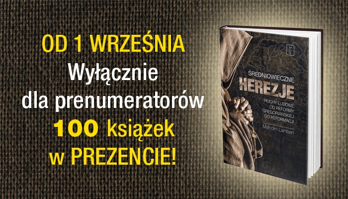 Zachęcamy do skorzystania z promocji. Tym bardziej, że książka „Średniowieczne herezje” Malcolma Lamberta jest niewątpliwie jedną z najlepszych pozycji wydanych na ten temat. Dla prenumeratorów przygotowaliśmy 100 książek.